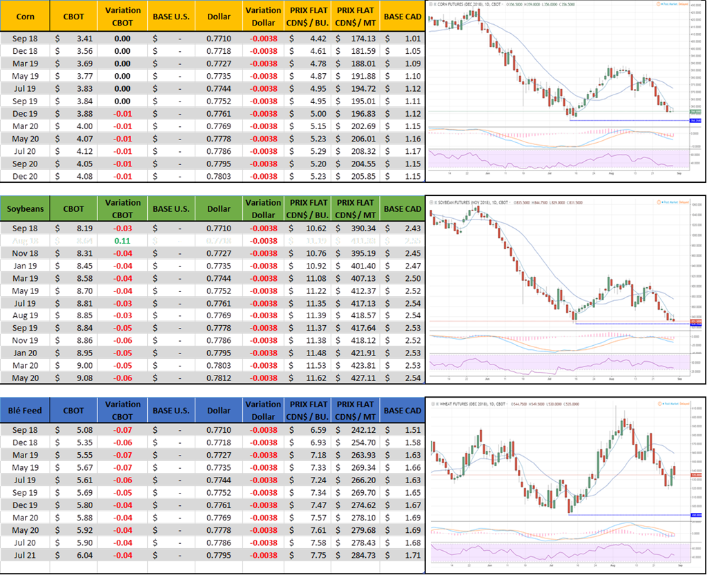 Le président Trump a déclaré qu'il souhaitait imposer des tarifs douaniers sur 200 milliards de dollars de produits chinois la semaine prochaine. Par contre, menute-papillon Il doit attendre que la période de consultation publique se termine le 6 septembre avant de prendre des mesures. Le marché a réagi rapidement ce PM aves les indices boursiers en baisse – mais pas outre mesure; 15-20 points sur le S&P500 c’est 0.50% de variation. J’ai hâte de voir si les soybeans vont être en spécial ce soir à 8PM – à surveiller.
