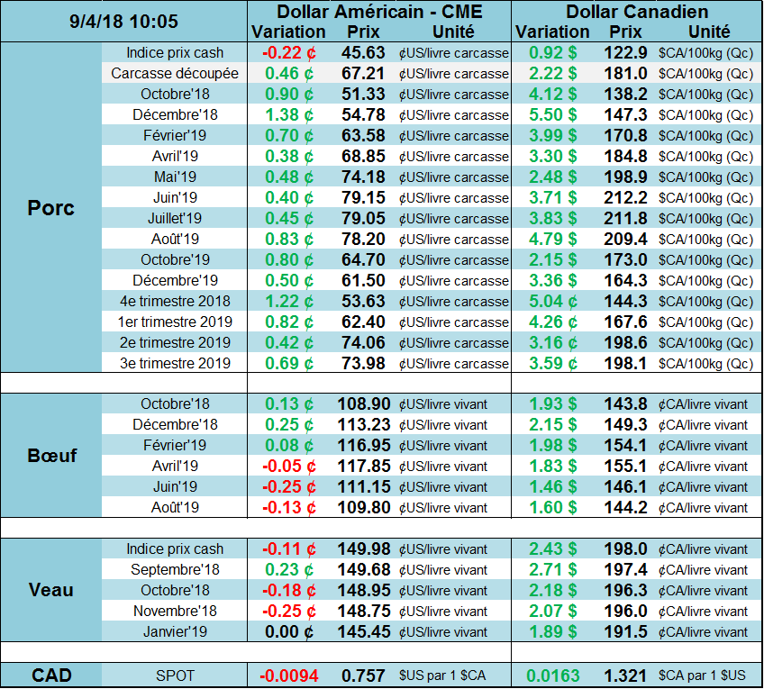 Le porc d’octobre a clôturé en hausse de +1.30¢/lb vendredi, à 50.43¢/lb. À ces prix, le porc d’octobre se négociait près de +4.50¢/lb au-dessus du prix cash. Plus le rebond du prix cash se fait attendre, moins il reste de temps pour le prix cash fasse son rebond tant attendu. Vendredi, le marché était optimiste sur les échéances plus lointaines, décembre gagnaient +0.77¢/lb, à 53.40¢/lb et février prenait +0.30¢/lb, à 62.88¢/lb.