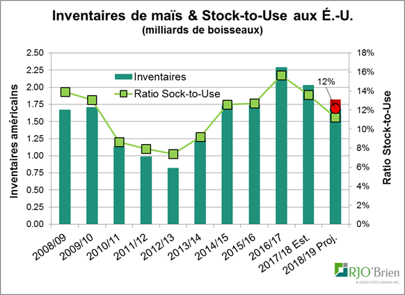 Tout ça mis ensemble, ça regarde bien pour le maïs, dont les inventaires devraient diminuer aux États-Unis si la demande continue de bien se porter. Essayons deux scénarios possibles : à 178.4 boisseaux à l’acre, les inventaires de fin seront à 1.68 milliards de boisseaux, comparativement à 2.03 milliards de boisseaux en 2017. Même si on est conservateur et que l’on estime un rendement à 180 boisseaux à l’acre (bande rouge), on finirait l’année avec des inventaires à 1.82 milliards de boisseaux. Tout de même en baisse importante! Cela laissera peu de marge de manœuvre pour la récolte 2019…