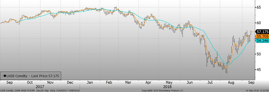 Les échéances plus lointaines continuent d’être supportées par le risque de contagion de peste porcine africaine en Asie. De plus, deux cas de la maladie ont été déclarés en Belgique chez des sangliers sauvages. La situation est loin d’être critique, mais il demeure que l’Union Européenne est le plus grand exportateur de porc au monde. Du côté des échéances de 2018, celles-ci tablent sur une remontée importante du prix cash qui devra se matérialise. Notamment oour les ventes d’hier et mercredi, le prix cash a bondi de +3.5 ¢/lb ce qui est du jamais vu! L’indice CME du prix cash sera publié à 52.44¢/lb lundi prochain, en hausse de +3.35 ¢/lb en 2 jours. Il semble qu’il y ait de l’espoir à l’horizon, car une ou deux autres bonnes publications pourraient supporter les contrats à termes.