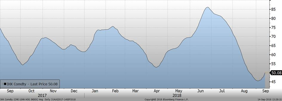 Selon l’USDA, les abattages étaient de 411 000 têtes hier ce qui amène le total pour la semaine à 1.749 million de têtes, en baisse de -80 000 têtes par rapport à l’an dernier. Il s’agissait d’une hausse de -4.4% versus 2017, principalement à cause des fermetures d’abattoirs de l’ouragan Florence.