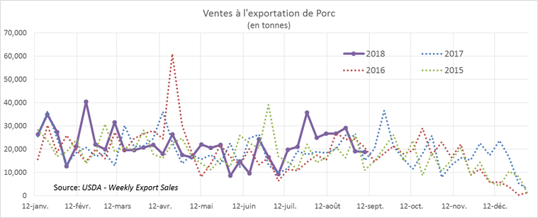 Selon l’USDA, les ventes à l’exportation pour la semaine du 6 septembre étaient de 18 717 tonnes. La semaine dernière, celles-ci étaient de 19 162 tonnes. Cela se compare à une moyenne de 25 420 tonnes pour les 4 publications précédentes. Les ventes à l’exportation ont perdues de la vigueur lors des deux dernières semaines, ce qui pourrait peser sur la demande et ultimement sur les prix.