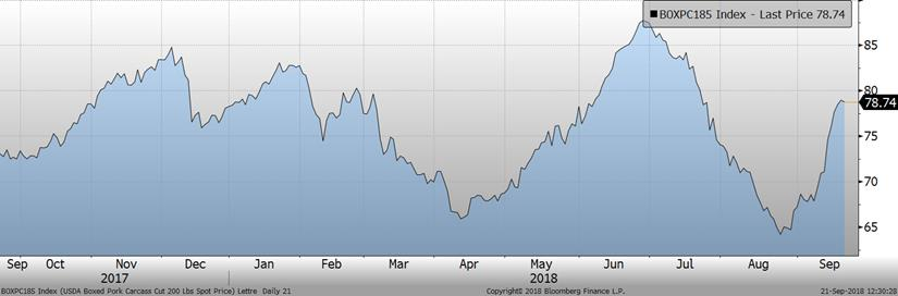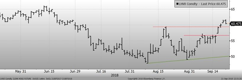 Il semble que la couverture des positions courtes par les spéculateurs et la diminution à court terme des abattages suite à l’ouragan Florence peuvent être cités comme sources de la récente flambée du prix cash, mais il est difficile de trouvé d’autres raisons pour soutenir une telle hausse bien plus longtemps alors que la production attendue au 4etrimestre devrait être 5 à 6% supérieure à l’an dernier. L’USDA nous donnera l’heure juste lors du rapport Hogs and Pigs jeudi prochain.