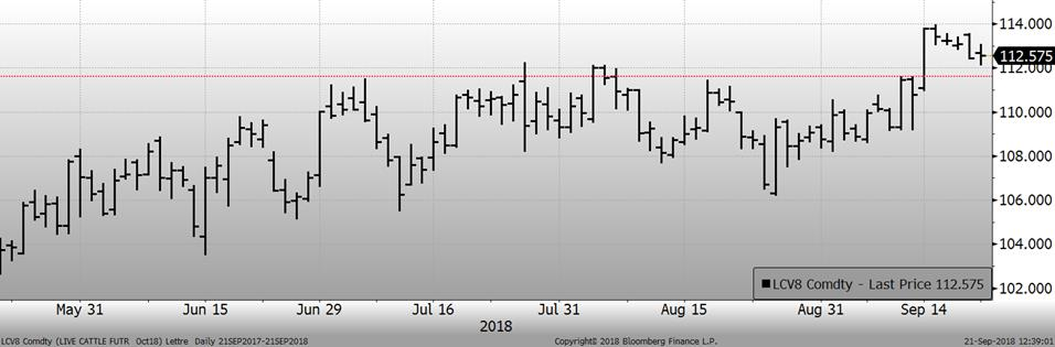 Selon l’USDA, les abattages étaient de 437 000 têtes hier ce qui amène le total pour la semaine à 1.709 million de têtes, en baisse de 40 000 têtes par rapport à la semaine précédente et d’une baisse de 108 000 têtes versus 2017, principalement à cause des fermetures d’abattoirs de l’ouragan Florence. La pression sur les prix reprendra lorsque les abattoirs rependront leur rythme habituel, ce qui pourrait ralentir la progression du prix cash à mesure que l’offre augmente à court terme.