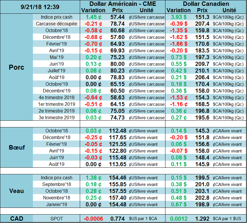 Une bonne nouvelle est que la demande semble être au rendez-vous avec la hausse du prix des découpes dans les derniers jours. Hier, ceux-ci étaient publiés à la hausse de +0.56¢/lb hier, à 78.95¢/lb, le plus haut depuis la fin juillet. Selon l’USDA, les ventes à l’exportation pour la semaine du 13 septembre étaient de 22 856 tonnes. La semaine précédente, celles-ci étaient de 18 717 tonnes. Cela se compare à une moyenne de 23 426 tonnes pour les 4 publications précédentes. Les ventes à l’exportation ont perdues de la vigueur lors des 3 dernières semaines, ce qui pourrait peser sur la demande et ultimement sur les prix. Avec la maladie en Chine, il se pourrait que les exportations explosent un jour… mais ce n’est pas pour cette année!