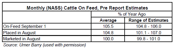 Ce vendredi, l’USDA publiera le rapport Cattle-on-Feed qui sonde les parcs d’engraissements avec plus de 1000 têtes pour avoir une idée des inventaires. Comme avant chaque publication, les analystes se sont prononcés sur le sujet. Il semble se dégager une question de leurs anticipations : est-ce que les placements de juillet du dernier rapport étaient anormalement élevés parce que ceux d’août avaient été devancés? Les analystes sont polarisés sur la question, car la moyenne de +4.8% d’augmentation des placements en août est composée de ceux qui croient à près de +2% d’augmentation et des autres qui croient à plus de 5% d’augmentation… On ne le saura qu’à 15h cet après-midi!