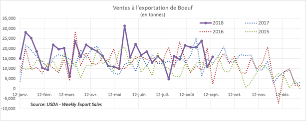 Hier, l’USDA publiait les ventes à l’exportation américaines pour la semaine du 13 septembre. Celles-ci rebondissaient de 5069 livres par rapport à la semaine précédente, à 15 894 livres. Pour ce temps-ci de l’année, ces niveaux de ventes à l’exportation sont dans la fourchette supérieure comparativement aux années précédentes. Jeudi, l’USDA estimait que les abattages étaient de 120 000 têtes ce qui amenait le total pour la semaine à 473 000 têtes, en hausse de +1.9% par rapport à l’an dernier (+9 000 têtes).