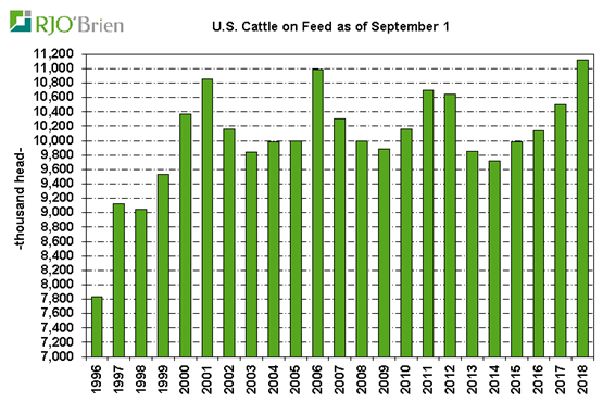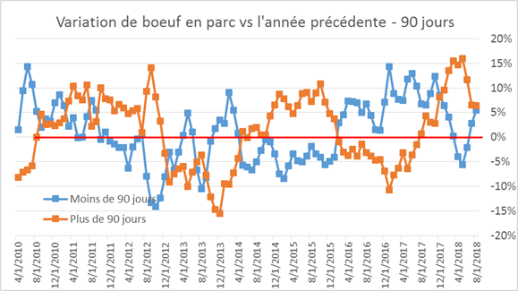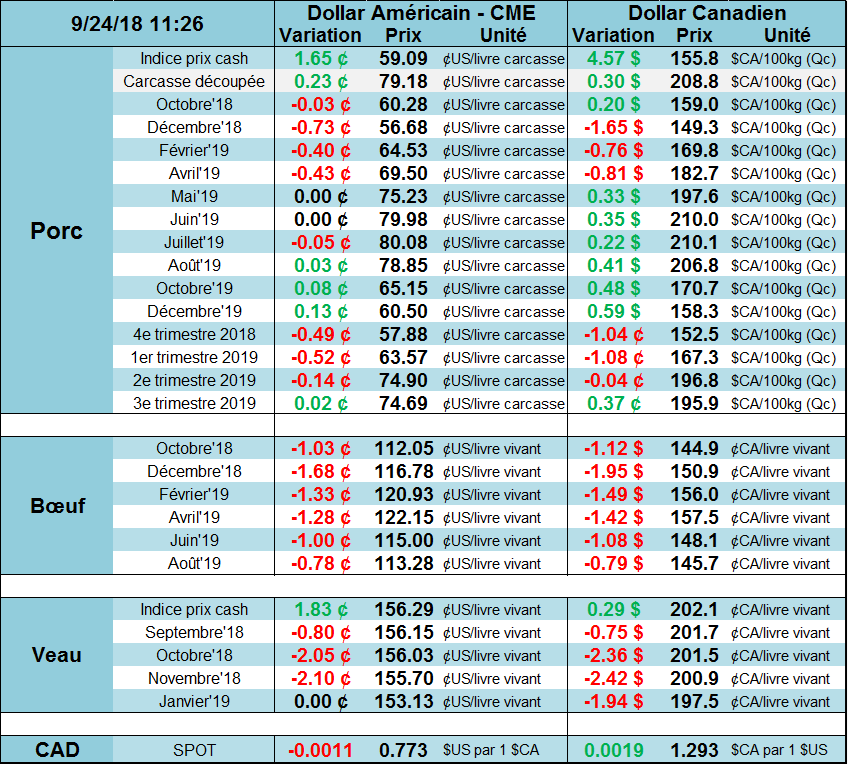 Le rapport Cattle-on-Feed publié vendredi dernier par l’USDA était plutôt négatif pour les échéances de 2019. Au final, la hausse de la quantité de placements de bœufs en parc était publiée à +7.5% par rapport à l’an dernier, au-dessus des attentes des analystes. Les mises en marché du mois d’août n’ont pas été bien différente que l’an dernier (+0.2% versus 2017), ce qui porte le total en parc à 11.13 millions de têtes au 1 septembre 2018, une hausse de +5.9% comparativement à 2017. L’augmentation de bœufs en parc versus 2017 est similaire pour les bœufs en parc depuis plus de 90 jours et moins de 90 jours, autour de +6%. En conclusion, le rapport est plutôt négatif pour l’offre à moyen terme, c’est-à-dire pour le premier trimestre de l’an prochain, le temps d’engraisser les veaux placés. Le marché baisse de 1.5¢ aujourd’hui sur l’ensemble des échéances.