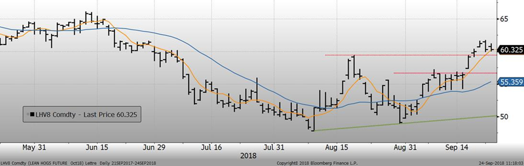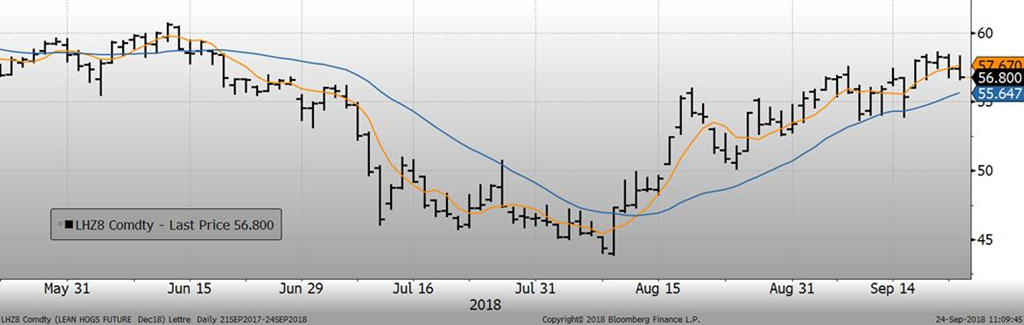 À plus court terme, le prix continue d’être soutenu par une croissance plus rapide du prix cash qu’à la normale à ce temps-ci de l’année. En effet, l’indice CME du prix cash pour la journée de jeudi était publié à 59.09¢/lb, une hausse de +1.65¢/lb par rapport à la veille. La vitesse à laquelle le prix cash grimpe semble avoir été stimulée par l’ouragan Florence. Bien que la production soit affectée négativement par l’ouragan, pour les prochaines semaines, on peut s’attendre à un retour à la normale en plus des porcs qui n’ont toujours pas été abattus. Nous émettons donc de sérieux doutes sur la capacité du cash à maintenir ce rythme et de maintenir ce niveau de prix. Le marché semble être du même avis puisque le prix cash est rendu au même niveau que le contrat d’octobre, indiquant qu’il y aura un revirement du cash d’ici 3 semaines.