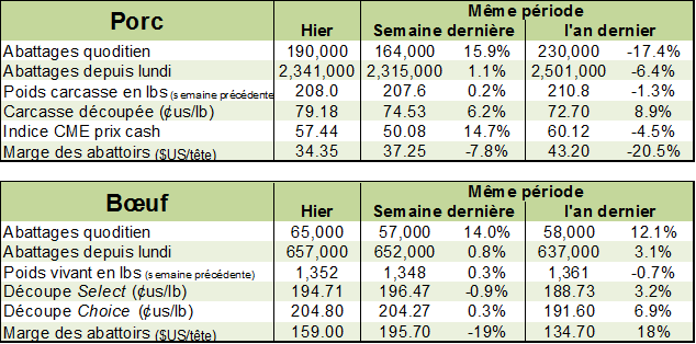 L’USDA estimait que les abattages étaient de 657 000 têtes la semaine dernière, une hausse de 5 000 têtes (+0.8%) comparativement à la semaine précédente. Comparativement à l’an dernier par contre, il s’agissait d’une hausse de +3.0% ou 19 000 têtes. Le Catte-on-Feed publiait que les mises en marchés pour le mois d’août n’avaient pas été bien différentes de l’an dernier, ce qui se reflétait également sur les statistiques d’abattage. Il ne semble pas que le marché craigne cette abondance de l’offre prévue d’ici la fin de l’année, car le contrat de décembre se transige actuellement près de +8¢/lb au-dessus du prix cash.