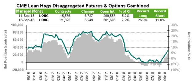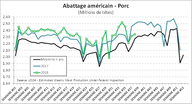 Selon l’USDA, les abattages étaient de 2.341 millions de têtes la semaine dernière, en baisse de -6.2% par rapport à l’an dernier, alors qu’on estime que les fermetures de capacité d’abattage dû à l’ouragan Florence depuis le 12 septembre ont causé un ralentissement de près de 400 000 têtes en Caroline du Nord. Tôt ou tard, les têtes qui auraient dû trouver le chemin des abattoirs devront y passer, ce qui mettra une pression sur les prix. Le poids par bête qui se maintient -1.3% sous l’an dernier, à 208 lb carcasse. Mis ensemble, la production était en baisse de -7.5% comparativement à 2017.