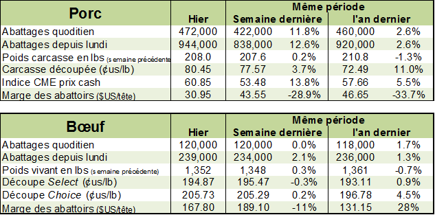 Les abattages étaient estimés à 120 000 têtes hier. Cela porte le total pour le début de la semaine à 239 000 têtes, en hausse de +1.3% ou 3000 têtes par rapport à l’an dernier.