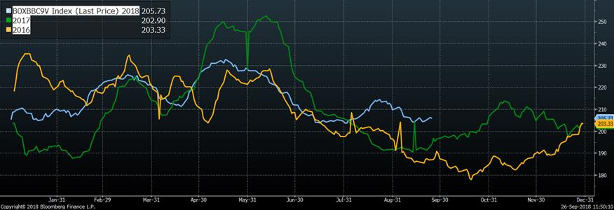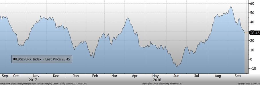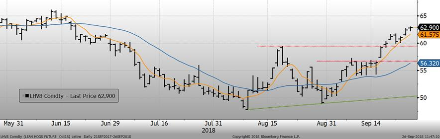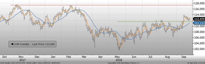 Hier, les estimés d’abattages de l’USDA étaient de 472 000 têtes versus 422 000 têtes la semaine dernière. Cela porte le total pour le début de la semaine à 944 000 têtes, en hausse de 106 000 têtes par rapport à la semaine dernière, alors que les abattoirs reprennent leur cadence normale après l’ouragan Florence. Il s’agissait également d’une hausse de +2.5% comparativement à l’année dernière.