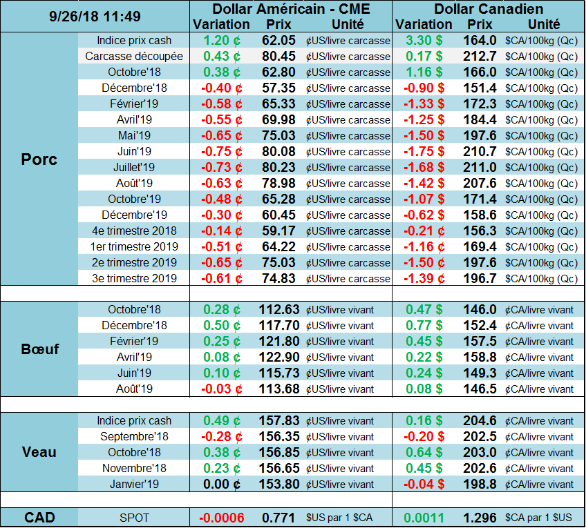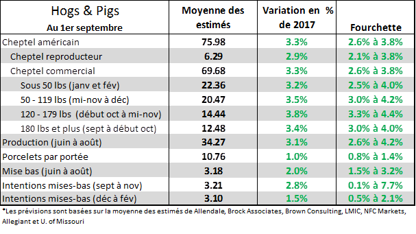 Demain, l’USDA publiera son rapport trimestriel sur le cheptel de porc au 1er septembre. Les analystes tablent sur une augmentation totale de +3.3% du cheptel américain comparativement à l’an dernier. En ce qui a trait aux poids, la hausse semble assez bien distribuée à travers les différents stades de croissance. La production pour les 5 semaines à venir (octobre à mi-novembre) qui correspond au troupeau de 120 à 179 lbs serait de 14.44 millions têtes, en hausse de +3.8%. Pour les autres classes de poids, la hausse devrait être légèrement inférieure, entre 3.2% et 3.5%. Au final, avec le dernier rapport en juin, on s’enlignerait pour une croissance des abattages d’environ +4% pour la 1èremoitié de 2019 et il semble que ce sera dans le même ordre de grandeur de +3.5 à +4%. Si le poids des carcasses demeure plus léger que l’an dernier, on pourrait retrancher 1% à la production qui tournerait de +2.5% à + 3.0%.