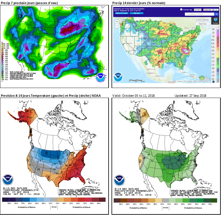 Les prix du blé d’inde et du soja sont en hausse depuis le début de la semaine passée. La consommation n’est pas mauvaise et la petite avance qu’on avait dans l’avancement de la récolte risque de disparaitre avec la pluie qui s’en vient. À mon avis cela peut soutenir le marché à court terme mais je doute qu’on pousse les prix fortement à la hausse simplement à cause de la météo. Je pense qu’il en faut plus. Ou est Donald?