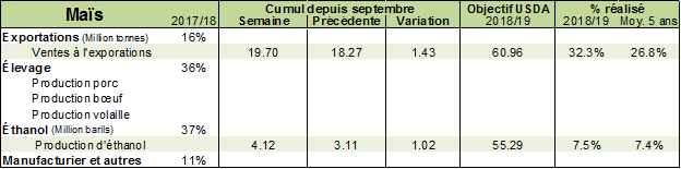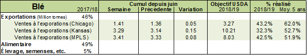 Côté blé, nous en sommes déjà à la 17e semaine de mise en marché, car selon le calendrier de l’USD, l’année commerciale débute en juin. Aux États-Unis, près de la moitié du blé est destiné à la consommation humaine. L’an dernier, l’industrie de la transformation agroalimentaire a utilisé 49% du blé et 46% s’est destiné à l’exportation. Comme la demande domestique est assez stable, le prix est principalement affecté par la demande extérieure, ce qui le rend sensible aux nouvelles de l’étranger. À ce stade, on peut déjà dire que les ventes à l’export accusent un retard comparativement aux années précédentes dans l’ensemble des types de blé. Normalement, plus de 50% de l’objectif d’exportation de l’USDA est déjà vendu à ce moment-ci de l’année, alors que cette année, moins de 43% de l’objectif d’exportation a déjà été vendu. On peut donc s’attendre à une révision des objectifs de vente par l’USDA si les ventes à l’exportation ne s’améliorent pas.