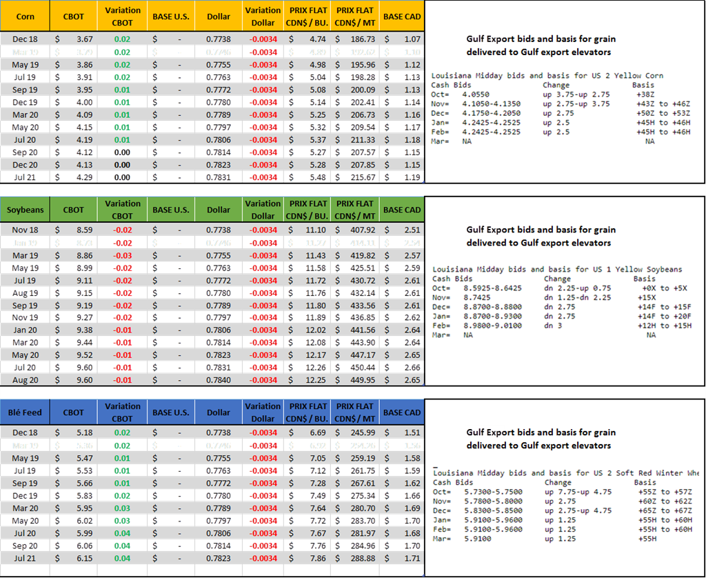 Actuellement le conflit politique fait énormément pression sur les prix et on ne voit pas la lumière au bout du tunnel, il ne faudrait donc pas retenir notre souffle pour revoir des binnes à 10$ sur Chicago. Les Chinois ont déjà annoncé leur couleur (est-ce un bluff?) et réduisent massivement leur achats de fève et de tourteau. Les meuniers mettent de moins et moins de tourteau de soja dans les moulées et le remplace par d’autre sous-produits. Le gouvernement américain annonce des compensations financières aux producteurs afin de réduire l’impact de la baisse des prix. Bref d’un côté comme de l’autre on se prépare à un conflit qui pourrait durer longtemps. Les brésiliens ne sont pas fous et vont augmenter les superficies le plus possible pour aller capturer des parts de marchés.