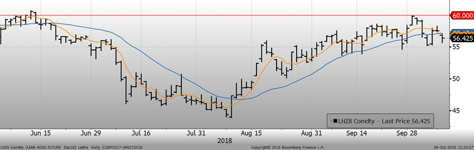 Après une remontée impressionnante du prix cash dans les dernières semaines, celui-ci montre maintenant des signes de plafonnements et il semble que le sommet a été atteint la semaine dernière. Ce matin, l’indice CME du prix cash pour la journée de lundi était publié en baisse de -0.03¢/lb, à 69.33¢/lb. À court terme, le potentiel haussier du prix est limité ce qui lancé le signal de vente qu’attendait plusieurs traders. À long terme cependant, il demeure que le risque haussier de voir la peste porcine africaine (PPA) prendre de l’ampleur en Chine est bien réel avec 28 cas rapportés dans 8 provinces différentes à ce jour. Est-ce que le froid hivernal causera une propagation des cas comme ce fût le cas en 2014 avec la DEP? Également, les tarifs mexicains devraient être retirés en 2019, un autre élément positif pour les prix. Toutefois, d’ici l’échéance de décembre, le prix cash pourrait connaître une sévère correction lorsque la hausse du prix cash se reflètera en épicerie en même temps des abattages records prévus à la fin novembre… il serait justifié d’entamer des ventes de porc pour le début 2019 avec l’objectif des racheter dans 2 mois.