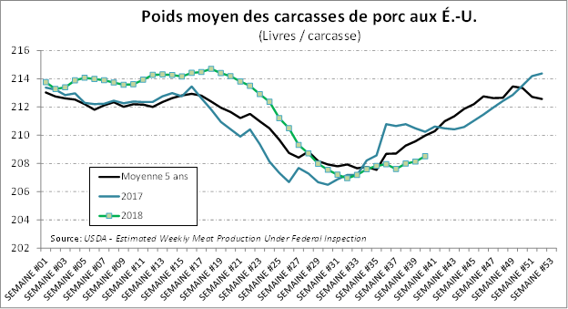Selon l’USDA, les abattages étaient de 2.503 millions de têtes la semaine dernière, en baisse de -2.2% par rapport à la semaine précédente. Il s’agissait également d’une baisse de -0.6% par rapport à l’an dernier. Le poids par bête qui se maintient -0.8% sous l’an dernier, à 208.5 lb carcasse. Mis ensemble, la production de la semaine dernière était en baisse de -1.5% comparativement à 2017.