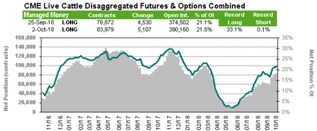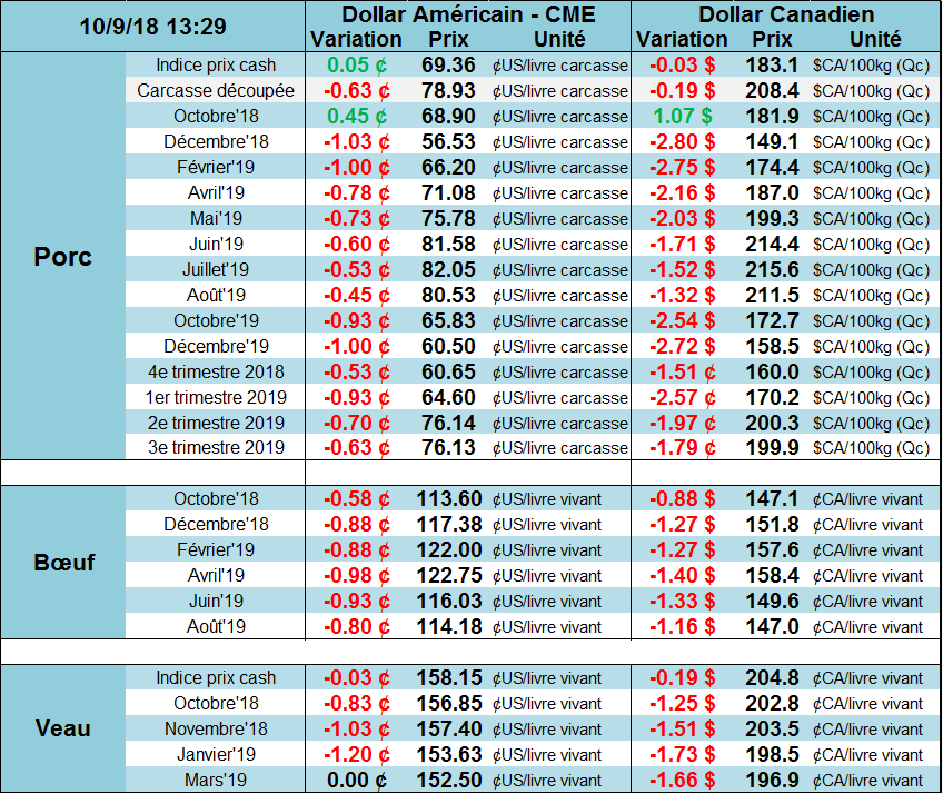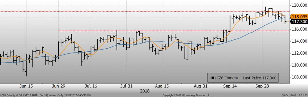 Lundi, l’échéance d’octobre terminait en hausse de +0.17¢/lb, alors que décembre (-0.22¢/lb) et février (-0.05¢/lb) clôturaient légèrement en baisse. Les différentes échéances clôturaient dans l’ordre, à 113.80¢/lb, 117.15¢/lb et 122.53¢/lb respectivement. Avec une bonne prime par rapport au cash et un renversement de tendance technique la semaine dernière, il semble que la pression va commencer à s’accumuler sur les prix du bœuf d’ici la fin de l’année. Le marché est peut-être trop optimiste à l’approche d’une période d’abondance de l’offre, car la semaine dernière, les transactions étaient conclues de 109 à 111¢/lb. Il est également important de garder en tête qu’une large position longue des spéculateurs peut mener à une correction advenant une liquidation de couverture.