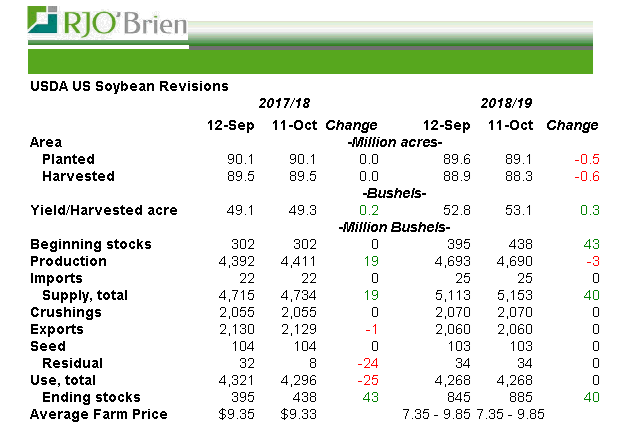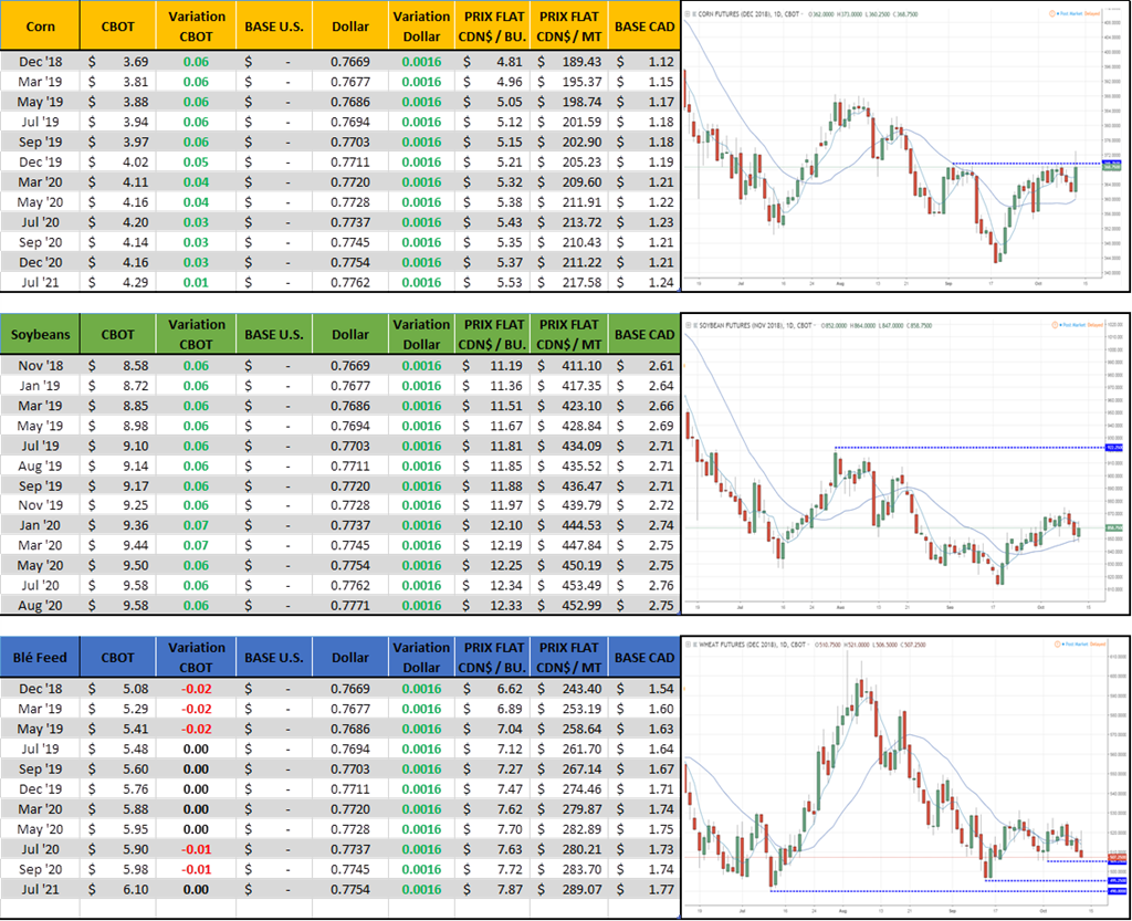 Soja : L’augmentation du rendement de 0.3 BPA est complètement contrecarrée par une réduction des ensemencements et donc au final la taille de la récolte est identique. Le marché a réagi positivement car on s’attendait à une augmentation des inventaires un peu plus grande que celle qu’on a eue aujourd’hui. En fait l’augmentation des inventaires aujourd’hui n’est qu’uniquement attribuable au stock d’ancienne récolte (le 43 million de boisseaux de plus du rapport en septembre). Très peu ou pas de changement sur la scène mondiale et les perspectives d’exportation. L’USDA aurait pu couper les exportations mais ne l’a pas fait.