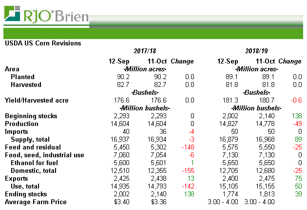 Maïs : avec l’état des cultures en septembre qui s’est améliorée ainsi que les stocks trimestriels plus élevés, les attentes étaient pour une augmentation des inventaires autour du 2 milliard de boisseaux. Ce ne fut pas le cas car l’USDA a réduit légèrement le rendement de 0.6 BPA. Le rendement est encore record, mais au lieu d’ajouter 50 à 100 millions de plus en production, la réduction a pour effet contraire. Au niveau de la demande, on voit une autre augmentation pour l’exportation avec 75 millions de boisseaux en plus tandis que l’élevage est réduit de 25 million. Une légère baisse du rendement conjointement à une augmentation de la demande fait en sorte que les 138 millions de boisseaux d’inventaire d’ancienne récolte sont à toute fin pratique utilisée. En septembre les inventaires de fin étaient de 1.774 milliard et ils sont rendus à 1.813 milliard, une mince augmentation. Les ratios d’utilisation sont à 12%, soit un niveau « normal » qui ne suggère nullement une variation prix majeure; d’un bord comme de l’autre. Jusqu’à nouvel ordre.