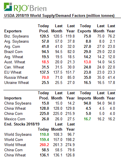 Révisions mondiales : hausse des inventaires mondiaux pour le maïs et le soja mais une baisse dans le cas du blé. Dans le cas du blé d’inde, les inventaires grimpent légèrement de 157 à 159.4 millions de tonnes, mais c’est tout de même plus faible que l’an dernier à 196 MT, d’où la force du programme d’exportation américain. Dans les fèves, on nage dans l’abondance en montant à 110 millions de tonnes comparativement à 108 il y a un mois et 96 l’an dernier. Pour le blé, tranquillement pas vite les inventaires baissent; de 274 millions l’an passé on a passé à 261 en septembre et maintenant 260. La carte cachée du blé c’est que plus de la moitié (52%) des inventaires de fin sont en Chine et non accessible à l’exportation. Les Chinois conservent le blé pour leur besoins domestiques et réserve stratégique. Ça change un peu la donne car s’il y a un hic de production comme cette année en Europe/Russie/Australie on devrait voir plus d’export de blé U.S. Mais ce n’est pas le cas, encore.