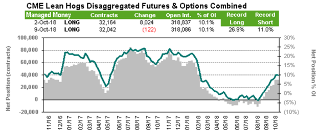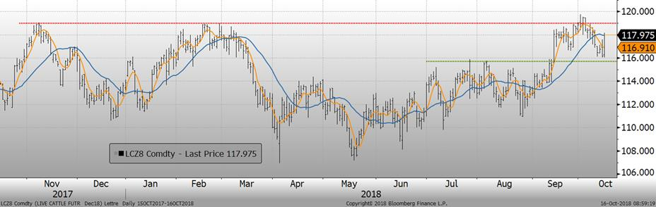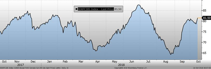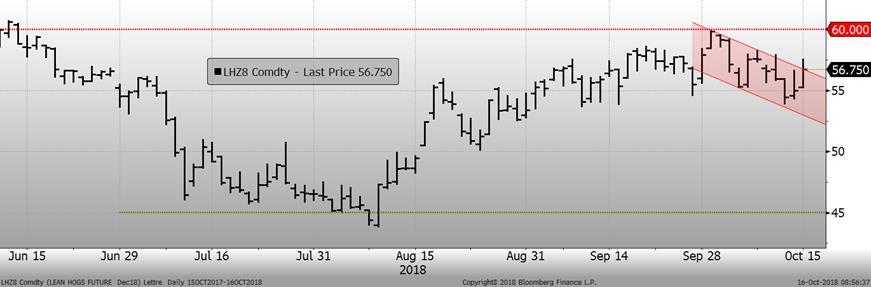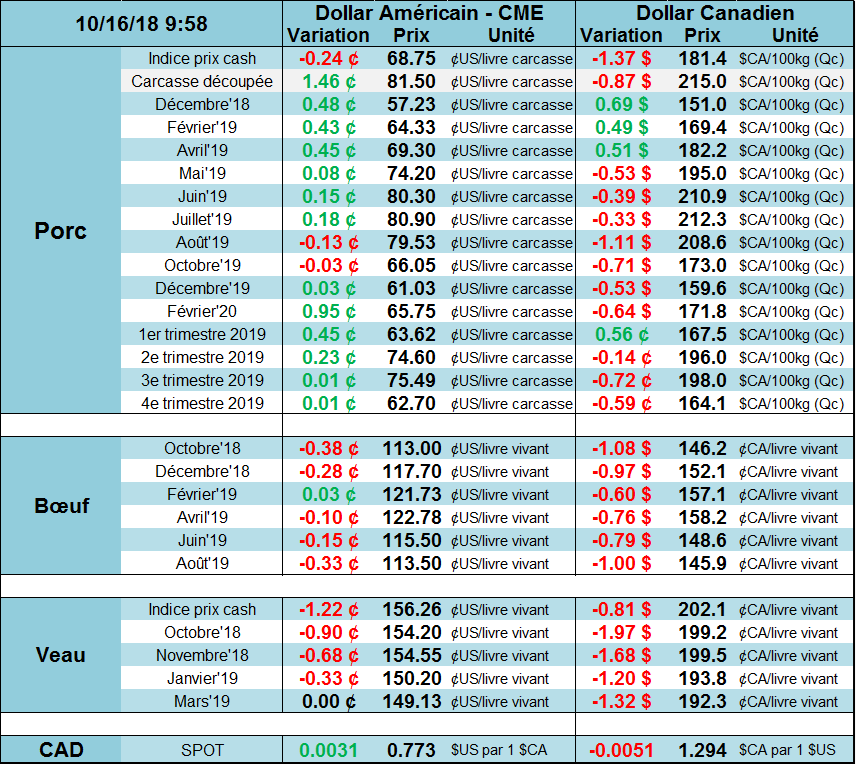 La semaine dernière, le porc de décembre a terminé en hausse de +0.57¢/lb, à 55.00¢/lb. L’indice du prix cash était publié à 68.75¢/lb aujourd’hui. L’écart entre le prix cash et les CàT de décembre s’est rétrécie aujourd’hui et est maintenant à 12¢/lb ce matin. Cette semaine, la progression du prix cash demeurera un facteur clef dans l’évolution du prix des CàT, car ultimement le prix va commencer à baisser lorsque que les abattages augmenteront pour atteindre leur record saisonnier en novembre.
