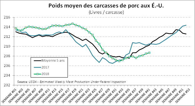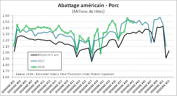 L’USDA estimait que les abattages étaient de 639 000 têtes la semaine dernière, en baisse de - 0.6%par rapport à la semaine précédente (-4000 têtes). Il s’agissait toutefois d’une hausse de +2.6 % par rapport à 2017. Avec le poids légèrement au-dessus de l’an dernier, la production était en hausse de +3.2% par rapport à l’an dernier.