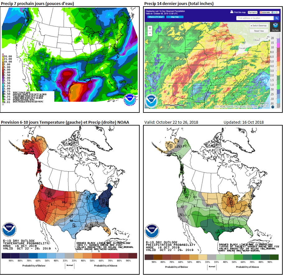 La météo sera plus clémente pour les récoltes dans les prochains 10 jours on s’attend donc à voir un solide progrès et possiblement une pression sur les prix et les bases comme c’est souvent le cas à cette période de l’année.