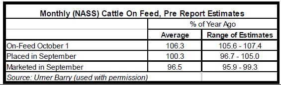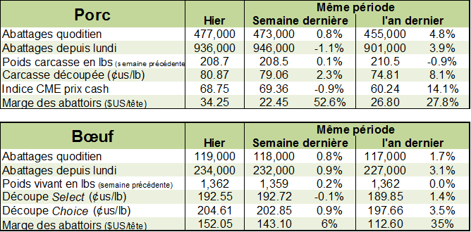 Ce vendredi, l’USDA publiera le rapport Cattle-on-Feed qui sonde les parcs d’engraissements avec plus de 1000 têtes pour avoir une idée des inventaires. Les prédictions des analystes se sont prononcées sur le sujet et la moyenne de leurs estimés donne le troupeau en parc en hausse de +6.3% en septembre par rapport à l’an dernier. Les placements anticipés sont inchangés par rapport à l’an dernier et une baisse de -3.5% des mises en marchés est attendue à l’approche du rapport. Il est cependant important de noter qu’une fois ajusté pour le nombre de jours d’abattages, le rythme de mise en marché était en hausse de +1.5% en septembre par rapport à l’an dernier. Ce qui sera à surveiller dans ce rapport est l’évolution des différentes classes de poids qui donneront une bonne indication du moment que l’offre à venir sera envoyée à l’abattoir.