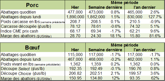 Selon l’USDA, les abattages étaient de 477 000 têtes hier pour un total de 1.890 million de têtes depuis le début de la semaine. Il s’agissait d’une hausse de 28 000 têtes par rapport à la semaine dernière. Comparativement à l’an dernier, les abattages étaient en hausse de +3.6% ou 66 000 têtes.