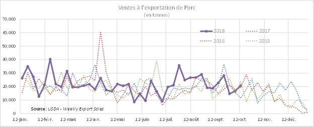 Selon l’USDA, les ventes à l’exportation pour la semaine du 11 octobre étaient en hausse de 4054 tonnes par rapport à la semaine précédente, à 20 762 tonnes. Sans être exceptionnels, ces niveaux sont dans les moyennes saisonnières et nettement mieux que les 2 dernières semaines où les ventes à l’export avaient drastiquement chutées. Celles-ci avaient perdues de la vigueur lors des dernières semaines à mesure que le prix cash prenait de la force. Il semble que les acheteurs étrangers avaient décidé d’attendre un environnement de prix plus favorable. De façon opposée, une diminution du prix cash favorisera un retour des volumes.
