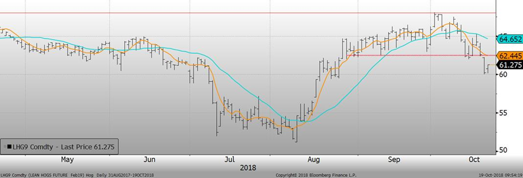 Hier, le porc de décembre perdait -2.40¢/lb, pour clôturer à 52.30¢/lb. Le marché anticipe déjà une importante baisse du prix cash pour les semaines à venir, alors que le cash a entamé une tendance baissière. Les échéances de février et avril terminaient en baisse de -2.35¢/lb et -1.50¢/lb, à 60.23¢/lb et 67.00¢/lb respectivement. Techniquement, la chute d’hier n’est pas positive puisqu’on a percé le support l’ouverture avec un « gap ». Le prix cash était publié en baisse de -0.42¢/lb mercredi et -0.41¢/lb jeudi, à 67.76¢/lb. Nous sommes d’avis qu’une bonne partie de la baisse a déjà été anticipée par le marché et qu’il reste moins de potentiel baissier qu’il y a une semaine.
