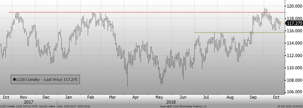 Les ventes à l’exportation américaines publiées hier par l’USDA pour la semaine du 11 octobre étaient légèrement en hausse par rapport à la semaine précédente, à 16 012 livres. À ces niveaux, les ventes à l’exportation ne sont pas un facteur négatif pour les prix, mais ne peuvent pas être considérées exceptionnelles et se comparent à la moyenne des 4 dernières semaines (16 844 livres). Jeudi, l’USDA estimait que les abattages étaient de 115 000 têtes ce qui amenait le total pour la semaine à 467 000 têtes, un rythme pratiquement inchangé par rapport à la semaine dernière (-1000 têtes). Il s’agissait d’une hausse de +0.2% par rapport à l’an dernier, alors que la hausse de production prévue par l’USDA est entre 2 et 3%.