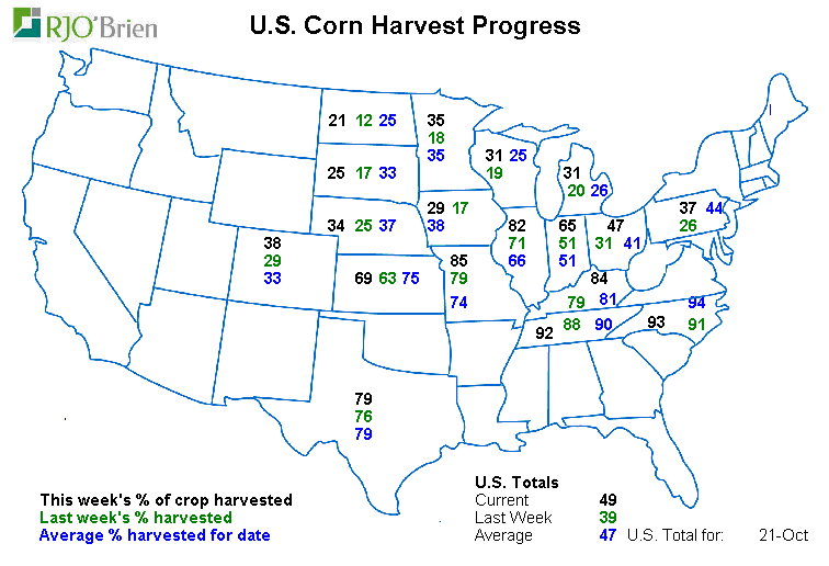 - Maïs: récolté à 49% versus 39% la semaine passée et 47% en moyenne