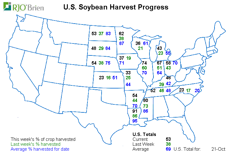 - Soja: récolté à 53% versus 38% la semaine passée et 69% en moyenne