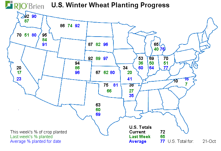 - Blé hiver: semé à 72% versus 65% la semaine passée et 77% en moyenne