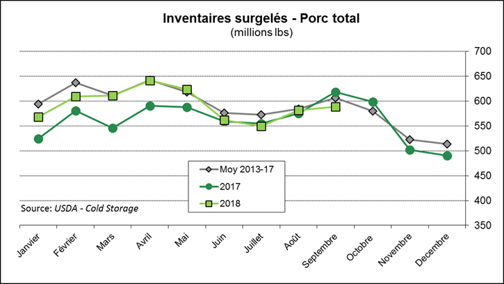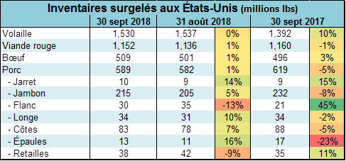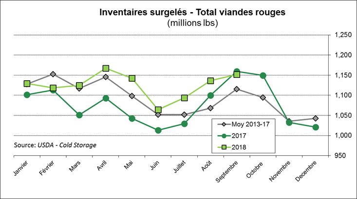 Au 30 septembre, les inventaires surgelés de bœuf étaient de 509 millions lbs, soit 3% de plus que l’an dernier et 9% de plus que la moyenne quinquennale. Sachant que les inventaires ont tendance à s’accumuler en octobre également, le marché est devenu inquiet avec cette abondance de viande. Aussi, les inventaires surgelés de viandes rouges étaient à 1.15 milliard de livres, en baisse de 1% versus l’an dernier (grâce au porc) et +3% versus la moyenne 5 ans.