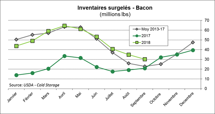 Au 30 septembre, les inventaires surgelés de porc était de 589 millions lbs, en hausse de 1% versus le mois d’août, mais 5% de moins qu’à la même date l’an dernier. La saisonnalité veut que les inventaires s’apprécient entre août et septembre, cependant on remarque que ce ne fût pas le cas cette année. On réalise que la faiblesse du prix cash à la fin août à forcement stimuler les exportations et la demande intérieur durant les semaines suivantes, résultant à des inventaires plus faibles que l’an dernier et un important rebond du prix des découpes en septembre (+13 ¢/lb). Parmi les coupes dont les inventaires sont « anormaux », il y a le flanc qui continue d’être abondant dans les congélateurs avec 45% plus de stock que l’an dernier et 32% de plus que la moyenne quinquennale. Aussi, l’épaule de porc devient une denrée rare avec des stocks en baisse de -23% depuis 1 an et 30% de moins que la moyenne 5 ans. Autrement dit, les consommateurs ont changé les club sandwichs pour le burger au porc effiloché!