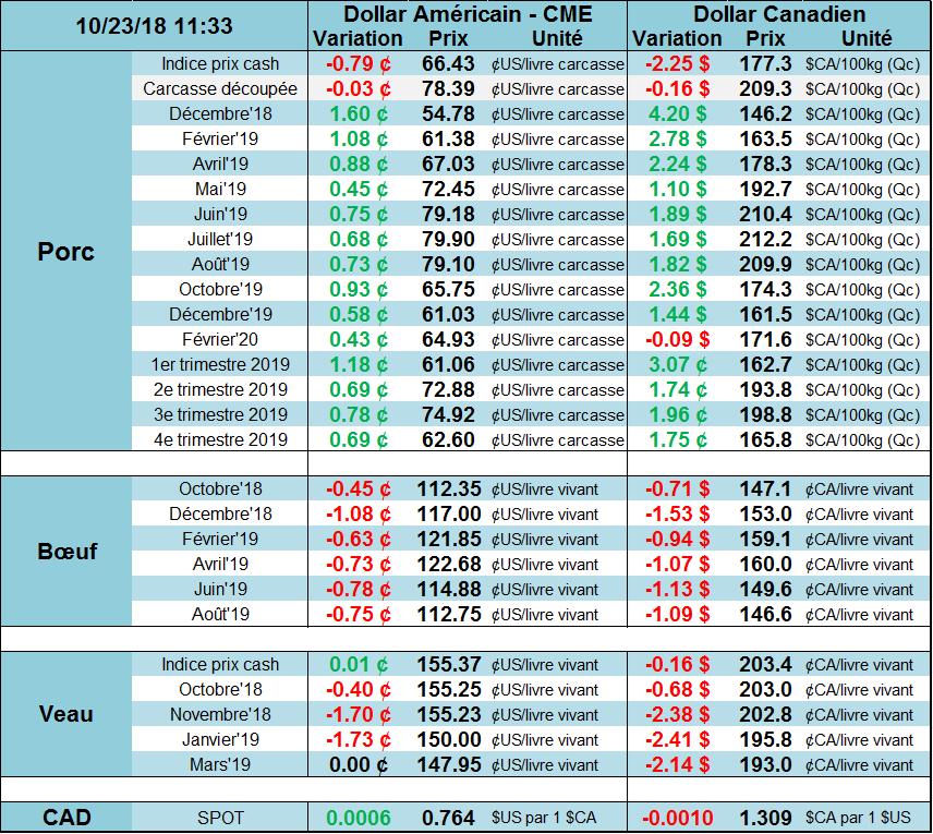 Le marché du porc rebondit depuis le début de la semaine puisque le marché cash semble chuter moins rapidement que ce qu’on aurait pu anticiper la semaine dernière. Pour la journée d’hier, la cash a baissé de seulement -0.32¢ vs -0.91¢ vendredi dernier… on ne tombe donc pas dans une tendance à -1¢ par jour ce qui envoie un vent d’optimisme sur le marché boursier. Le contrat de décembre regagne +3¢ depuis la fermeture de la semaine dernière. De plus, la valeur de la carcasse découpée restait à 78.39 ¢/lb hier, le même niveau depuis 4 jours. Tel que d’écrit en détail hier, l’écart entre le prix cash et les marchés boursiers est très large, donc le fait de voir le cash baisser moins vite est cohérent avec le rebond de cette semaine.