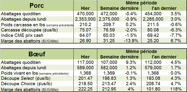 L’USDA estimait que les abattages étaient de 643 000 têtes la semaine dernière, une hausse de 10 000 têtes comparativement à la semaine précédente. Comparativement à l’an dernier par contre, il s’agissait d’une baisse de -0.5% ou 3 000 têtes.