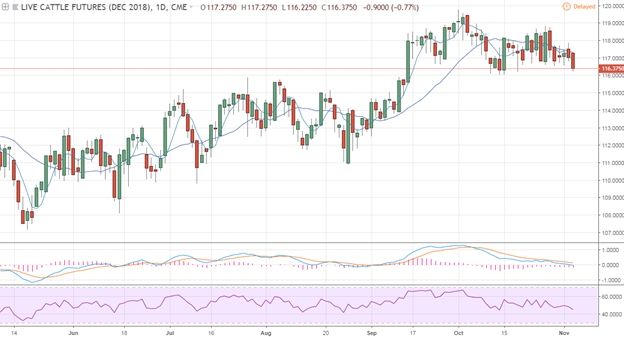 Vendredi, le bœuf terminait légèrement en baisse. Les échéances de décembre (-0.05¢/lb), février (-0.15¢/lb) et avril (-0.10¢/lb) suivaient une tendance similaires. Celles-ci clôturaient dans l’ordre, à 117.08¢/lb, 122.20¢/lb et 123.73¢/lb respectivement. Avec peu de transactions physiques concluent la semaine dernière, il semble que la pression va commencer à s’accumuler pour que des transactions soient concluent. La faiblesse des volumes de transaction la semaine dernière n’est pas de bon augure pour le prix cash qui se transigeait près de 114¢/lb dans les plaines la semaine dernière, mais il demeure un bon écart entre ce que les parcs d’engraissements demandent (118¢/lb) et ce que les abattoirs sont près à offrir (112¢/lb). Pour le moment, le marché semble partager l’avis des éleveurs, à savoir, que la demande sera suffisamment forte pour supporter des prix de 117-118¢/lb jusqu’en décembre.