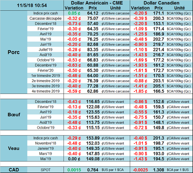 Dans les prochains jours, le marché se concentrera sur la baisse du prix cash sans toutefois oublier de rester attentif à l’évolution du prix des découpes, car l’abondance de l’offre à court terme pourrait bien peser sur les prix si la demande ne se maintient pas à court terme. En ce moment, le marché anticipe une baisse appréciable du prix cash alors que le contrat de décembre se négocie près de 7¢/lb sous le prix cash. Ce matin, l’indice CME du prix cash pour la journée de vendredi était publié en hausse de +0.04¢/lb, à 64.12¢/lb. La tendance demeure cependant négative et il reste à savoir à quelle vitesse le cash va diminuer au cours des prochaines semaines.