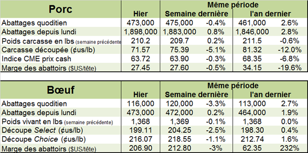 Jeudi, l’USDA estimait que les abattages étaient de 116 000 têtes ce qui amenait le total pour la semaine à 473 000 têtes, un rythme pratiquement inchangé par rapport à la semaine dernière (+1000 têtes). Il s’agissait d’une hausse de +1.1% par rapport à l’an dernier, alors que la hausse de production prévue par l’USDA est entre +2 et +3%.