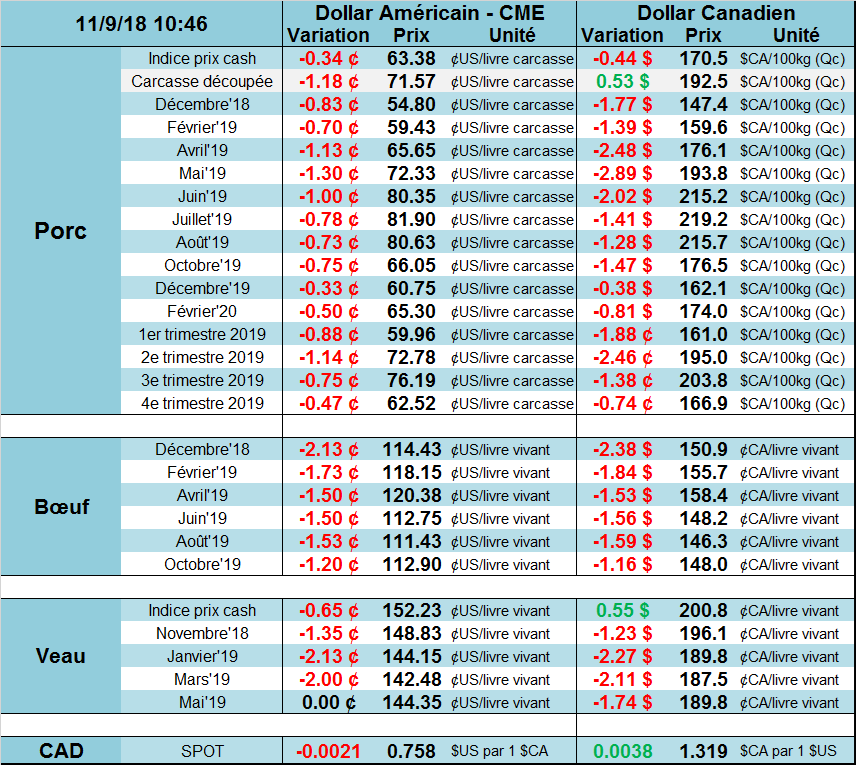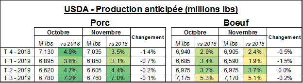 Dans le rapport Offre et demande de l’USDA (WASDE), les prévisions de production ont également été revue à la baisse dans le bœuf. Pour le 4e trimestre, la production a été ajustée à la baisse (-0.5 %), à 6.905 milliards de livre, mais la plus grande révision est pour le premier trimestre de 2019 pour lequel la croissance anticipée passe de +3.4% à 1.9%. Somme toute, le rapport est positif pour les prix car l’offre est revue à la baisse pour la première moitié de l’année prochaine.