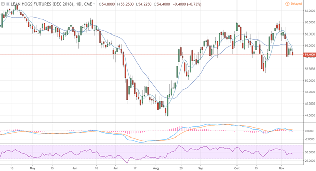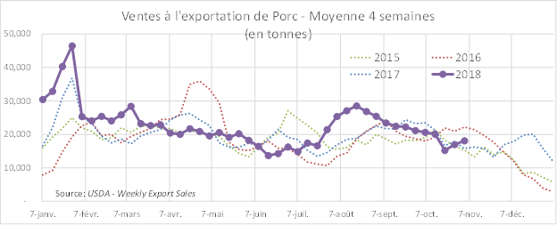 Selon l’USDA, les ventes à l’exportation pour la semaine du 1er novembre étaient pratiquement inchangées par rapport à la semaine précédente, à 21 115 tonnes. Ces niveaux sont dans les moyennes saisonnières et constituent une amélioration par rapport au mois d’octobre. Les abattages étaient de 473 000 têtes hier pour un total de 1.898 million de têtes depuis le début de la semaine, en hausse de 15 000 têtes par rapport à la semaine dernière ou de +2.8% par rapport à la même période en 2017.