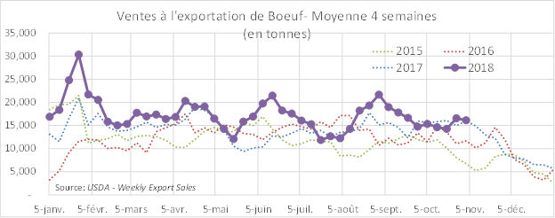 Les ventes à l’exportation américaines publiées hier par l’USDA étaient largement à la baisse (-13 807 livres) par rapport au niveau record de la semaine précédente, à 11 504 livres. Avant de conclure trop rapidement, il faut s’intéresser à la moyenne des dernières semaines qui nous rappelle qu’une semaine n’est pas la tendance et que la situation est loin d’être dramatique. La moyenne des 4 dernières semaines continue de se maintenir au-dessus des dernières années, à 16 329 livres.