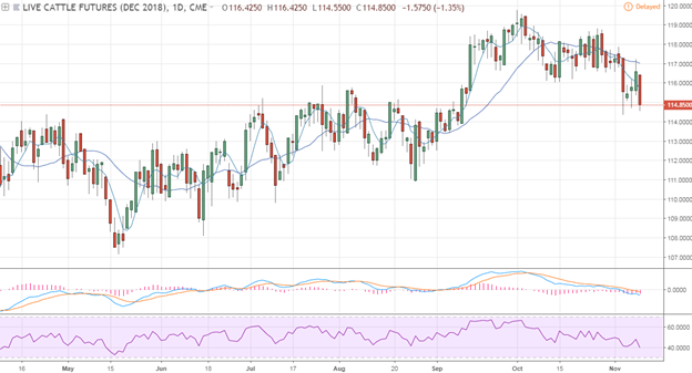 Hier, le bœuf était légèrement positif et terminait en hausse de +0.45¢/lb, à 116.55¢/lb sur décembre, alors que février (+0.27¢/lb) clôturait à 119.88¢/lb. Pour l’instant, le bœuf de décembre continue de se maintenir dans son canal technique et de se transiger entre 115¢/lb et 119 ¢/lb supporté par la forte demande et une croissance de l’offre qui se maintiendra sous +2%.