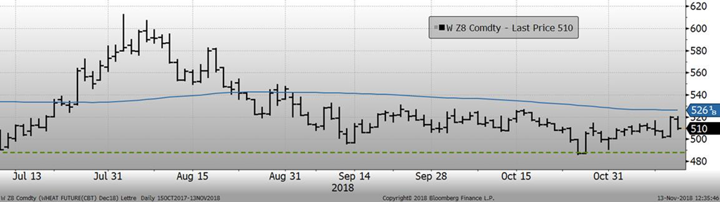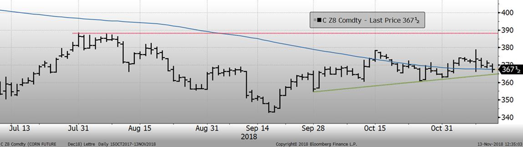 Du côté du maïs, malgré un rapport positif du WASDE pour la production locale, les prix diminuaient. Le maïs de décembre baissait de -0,4% hier et -1.1% aujourd’hui. Présentement, le maïs de décembre est exactement sur la moyenne mobile 100 jours de 3,67 ½ $. Il faudra attendre de voir la force de la demande cet hiver avant de voir le prix pourrait sortir du canal formé d’un support à 3,60$ et d’une résistance dans la zone des 3.78$.